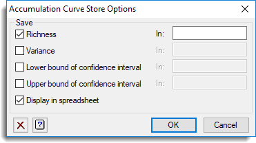 This menu lets you save results for a species accumulation or rarefaction curve. These results are saved when the graph is run and should be specified before generating the plot.