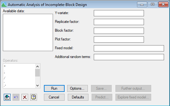 Select menu: Stats | Mixed Models (REML) | Automatic Analyses | Incomplete-Block Design