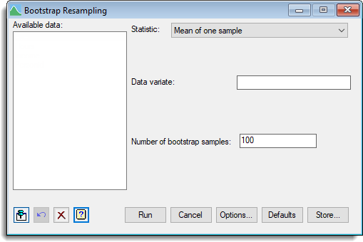This menu provides a list of some standard statistics that are to be bootstrapped. However, the Genstat command language code that is generated in the Input Log by the menu could be used as template for other statistics. When an analysis is run a procedure called RESAMPLE is automatically generated for the selected statistic and this is used by the BOOTSTRAP procedure to perform the bootstrapping. To perform bootstrapping for a statistic not provided on this menu you will need to create your own RESAMPLE procedure in command mode. The BOOTSTRAP procedure provides help on writing the RESAMPLE procedure and further references.