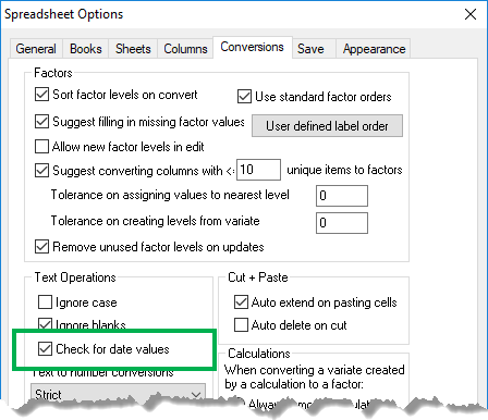 On the Tools | Spreadsheet Options | Conversions tab, the option Check for date values lets you automatically check new columns for data that appears to be in date format. When selected, Genstat checks all text columns to see if they contain data in date format.