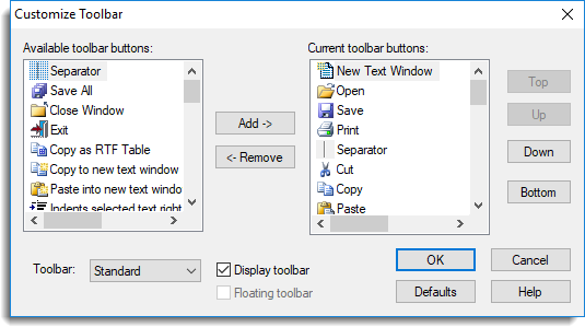 This lists the current selection of buttons that will appear on the toolbar. The buttons will appear in the order that they are shown in the list. You can move buttons in the list by using the Top, Up, Down and Bottom buttons.