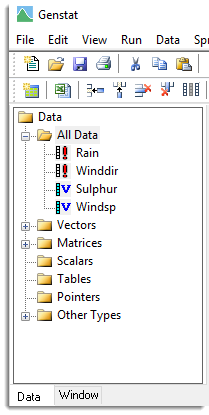 The data view provides a display of all the data structures that are currently available within Genstat in a docked pane on the left hand side of the interface. The view contains a tree list of all the different types of data folders that are available in Genstat. Each data folder contains data structures and/or data folders. When you select a folder the data structures and data/or folders contained within that folder are displayed in the list.