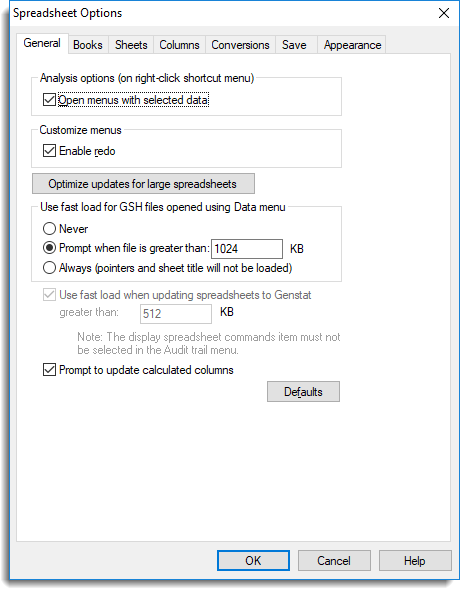 When selected spreadsheets greater than the size specified in the space provided will be updated to the Genstat Server using the fast load method. Also, the SPLOAD directive will be displayed in the Input log as opposed to the usual READ statements.