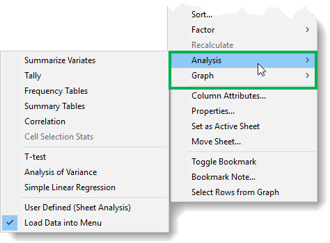 Within the spreadsheet right-click shortcut menu there are two submenus: Analysis and Graphics. These contain shortcuts to some of the more commonly used statistical and graphical menus. The names of the columns in the spreadsheet are passed to these menus and if you select any columns they are submitted in the order they were selected. When Open menus with selected data is enabled the corresponding statistical or graphics menu is opened with the selected columns entered into the appropriate fields (otherwise the analysis or graph is run automatically). If there are not enough columns selected for the analysis or graph to run automatically the appropriate menu will be opened with partial information entered. Note: the ANOVA, t-test and regression menus are always opened with the selected data.