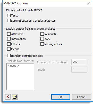 A list of the block factors in the current design that can excluded from the randomization for the permutation test. The most common instance where this is required is when one of the treatment factors involves time-order which cannot be randomized. You can select one or more block factors to be excluded from the randomization.