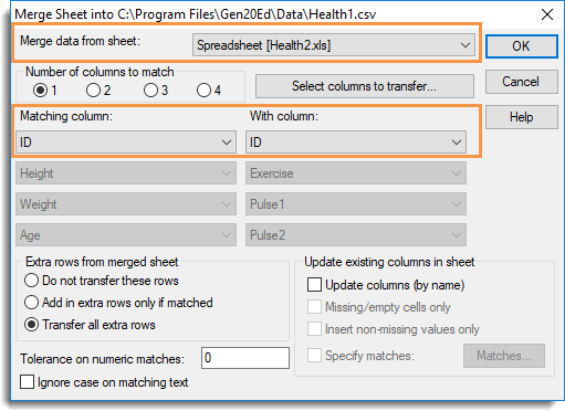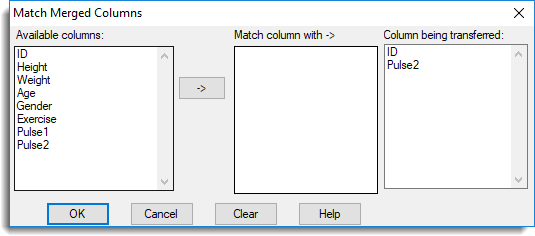 This opens a new dialog that lets you specify matches between columns in the two spreadsheets. Available columns contains columns from the first spreadsheet, which will have data added to it. For each column being transferred, a column from the original spreadsheet is selected. If no column in the original spreadsheet is selected, then the merged column will be added in as a new column in the current spreadsheet.