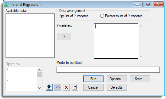 The data can be supplied as a list of variates or a pointer to the list of variates. The results on each y-variate are saved, indexed by the y-variate. If the y-variates are stacked the spreadsheet unstack dialog can be used to reorganise the data. Alternatively, the microarray one channel regression menu provides an alternative way to analyse stacked data.