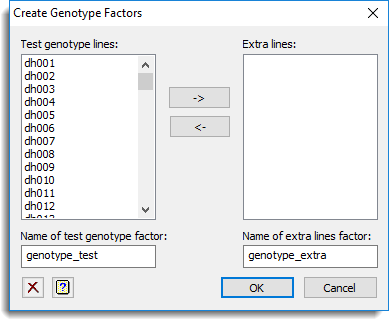 Use this to partition a genotype factor into test genotypes (i.e. genotypes that are to be taken forward to QTL analysis) and extra genotypes present in the trial (eg. check lines and/or parents). This dialog appears when you select a genotype to partition and click OK.
