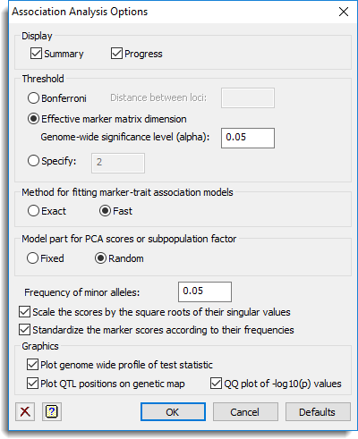 This defines the method to use to fit marker-trait association models, either Exact or Fast. For the exact method, the mixed models are solved for each marker separately. For the fast method, the mixed model is only solved for the genetic background model, without the markers in the model. The estimated variance-covariance matrix from this genetic background model is used to perform a generalized least squares scan for all the marker. The fast method is implemented only for bi-allelic markers, such as SNPs.
