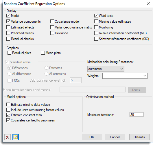 This controls whether Wald tests for fixed effects are accompanied with approximate F statistics and corresponding numbers of residual degrees of freedom. The computations, using the method devised by Kenward & Roger (1997), can be time consuming with large or complicated models. So, the default setting automatic, can be used to allow Genstat to assess the model itself and decide automatically whether to do the computations and which method to use. The other settings allow you to control what to do yourself: