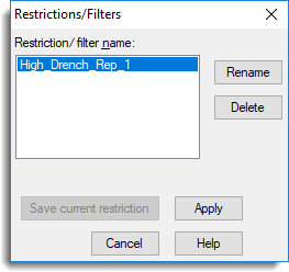 Your new restriction now appears in the list. When you next open the spreadsheet you can use the filter again by opening this dialog (Spread | Restrict/Filter | Save/Apply) and clicking Apply.