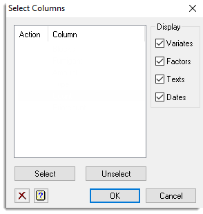 Use this to select columns within a spreadsheet to enable an action to be done on all the selected columns, for example editing their attributes or copying the cell contents on to the clipboard. The selected columns are displayed with the flag Sel beside the column name.