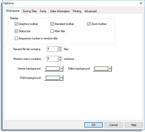 Opens the options property sheet to allow customization of various aspects of the graphical display. See under the following sub-headings for further details: