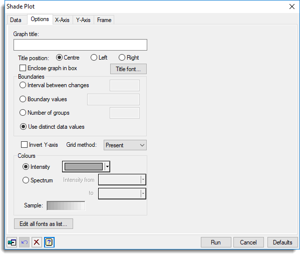 Lets you define the boundaries for the data values for each shade. You can specify the boundaries of each of the shades by selecting Boundary values and entering a list of the values in the space provided. Similarly, you can specify the size of an interval for all the shades by selecting Interval between changes and entering the value into the space provided there. Alternatively, you can specify the exact number of shades by selecting Number of groups or let Genstat define the boundaries by selecting Use distinct data values. In this case Genstat uses a different shade for each distinct data value.